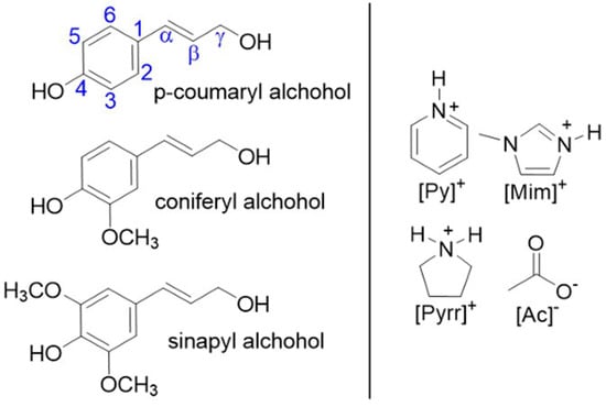 (left) The basic units of lignin; p-coumaryl (hydroxyphenyl), coniferyl (guaiacyl), and sinapyl (syringyl) alcohol, and (right) the PIL ions and their abbreviations: pyridinium [Py]+, 1-methylimidazolium [Mim]+, pyrrolidinium [Pyrr]+and acetate [Ac]−.