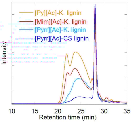These outcomes are supported by the SEC chromatograms from which the MWs were calculated. Figure 2 shows that in the [Pyrr][Ac]-CS lignin, with lower dispersity, there is a reduction of the broad peak at t < 27 min for larger MW lignins, while the intensity of the peak at t ~ 28 min for lower MW lignin is heightened. This confirms that the [Pyrr][Ac]-PIL is more suitable for uniform lignin fragmentation. It is important to also note that for the [Pyrr][Ac]-CS lignin, the acetylated lignin samples are not completely dissolved in THF as this lignin is closer to native lignin, and is not easily dissolved in typical organic solvents (unlike kraft lignin). This has also been observed in other PIL-extracted lignins [30]. However, the conclusions described in the previous paragraph remain valid, as the data from the [Pyrr][Ac]-K. lignin chromatogram supports the trends observed.