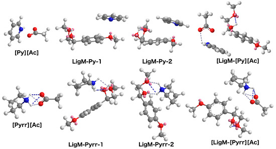 The PIL of interest, however, is the [Pyrr][Ac]-PIL (which has been shown to extract large amounts of lignin from biomass). This has been attributed to the high ionicity of the PILs, as well as, the hydrogen-bonding network established in these PILs. The simulations, however, do not provide much information about the interactions between these PIL ions and the LigM molecule (Figure 4). The minimal energy state of the PIL ions and the LigM molecule is the same when they are apart. The pyrrolidine base (unlike the pyridine base above) interacts with the –OH groups in the LigM molecules, and has no interactions with the benzene rings. This reagent has a low kraft lignin solubility [21], indicating that the π–π interactions between the aromatic groups are important for lignin dissolution in the aromatic–amine PILs. These analyses provide further information into the factors that contribute to lignin dissolution. However, more extensive simulations with multiple ions for the PILs and a three-dimensional lignin model could be beneficial for delineating the mechanism behind lignin dissolution on a macromolecular level [47].