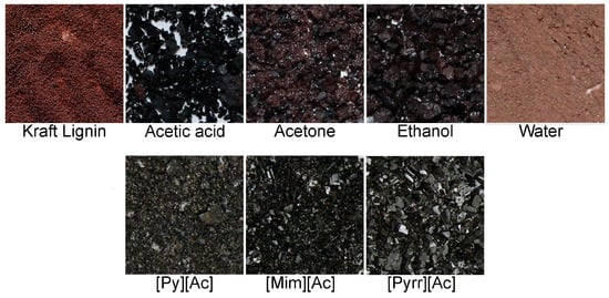 Images (10×) of kraft lignin recovered from solvent and PIL dissolution after heating at 90 °C and 24 h.