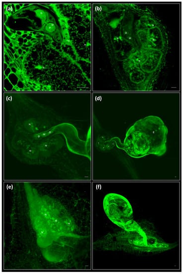 - Vieira, P.; Engler, G.; de Almeida Engler, J. Whole-mount confocal imaging of nuclei in giant feeding cells induced by root-knot nematodes in arabidopsis. New Phytol. 2012, 195, 488–496. [Google Scholar] [CrossRef] [PubMed]