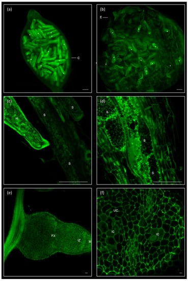 - Fester, T.; Berg, R.H.; Taylor, C.G. An easy method using glutaraldehyde-introduced fluorescence for the microscopic analysis of plant biotrophic interactions. J. Microsc. 2008, 231, 342–348. [Google Scholar] [CrossRef] [PubMed]