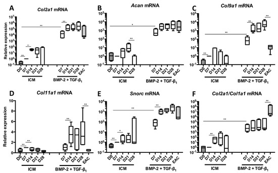 Kinetic study of mRNA expression encoding the markers specific to articular cartilage during chondrogenic differentiation of MSCs. Equine MSCs derived from bone marrow were amplified and seeded in collagen sponges at P4 (n = 5). They were then grown in hypoxia (3% O2) for 7, 14, 21 and 28 days (D7, D14, D21 and D28, respectively) in the presence of incomplete chondrogenic medium (ICM) alone or enriched with BMP-2 (50 ng/mL) and TGF-β1 (10 ng/mL) (BMP-2 + TGF-β1). The D0 condition corresponds to stem cells cultured in monolayer at P4 with the amplification medium and the equine articular chondrocyte (EAC) condition corresponds to the mRNAs extracted from EACs obtained after enzymatic digestion of healthy cartilage. mRNAs encoding Col2a1 (A); Acan (B); Col9a1 (C); Col11a1 (D) and Snorc (E) were estimated by RT-qPCR after normalization relative to the β-actin reference gene. The Col2a1:Col1a1 ratio (F) is shown. The results are represented as box plots (median, quartiles, extreme values) and the significance of the values was tested using the Mann-Whitney test (* p < 0.05, ** p < 0.01).