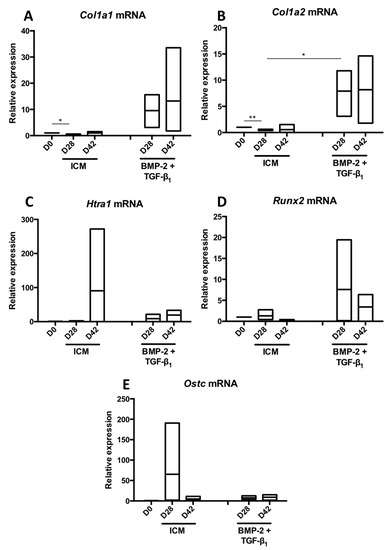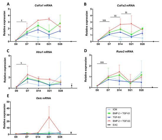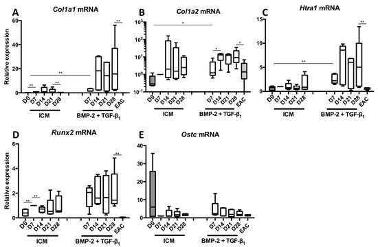 Regarding Col1a2 mRNAs, the treatment of BM-MSCs with the chondrogenic factors did not seem to substantially induce its expression compared with the Col1a1 and Htra1 mRNAs compared with the ICM control. Regarding Runx2, an early marker of chondrocyte hypertrophy, its expression, initially induced in control conditions and even more when the cells were cultured in the presence of BMP-2 + TGF-β1, tended to decrease after 14 days of culture. Its expression remains stable between D14 and D28. However, Runx2 expression still remained higher than that found in EACs (Figure 2D). The mRNA steady-state amounts of Ostc did not seem modulated in these culture conditions and remained at the same order of magnitude as what is found in EACs (Figure 2E).