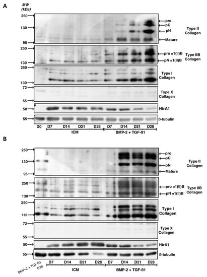 Kinetic study of the expression of cartilage matrix proteins during chondrogenic differentiation of MSCs. Equine MSCs derived from bone marrow were amplified and seeded in collagen sponges at P4 (n = 3). They were then grown in hypoxia (3% O2) for 7, 14, 21 and 28 days (D7, D14, D21 and D28, respectively) in the presence of incomplete chondrogenic medium (ICM) alone or enriched with BMP-2 (50 ng/mL) and TGF-β1 (10 ng/mL) (BMP-2 + TGF-β1). The sponges were harvested and crushed. The total protein extracts were separated by electrophoresis on a 10% acrylamide gel under denaturing conditions. The proteins were then transferred to a PVDF membrane which was incubated with the anti-collagen II, anti-collagen IIB, anti-collagen I, anti-collagen X, anti-HtrA1 or anti-β-tubulin primary antibody. The molecular weight marker (MW kDa) is indicated on the left. Two representative experiments from two strains of MSCs are shown in panels (A,B).