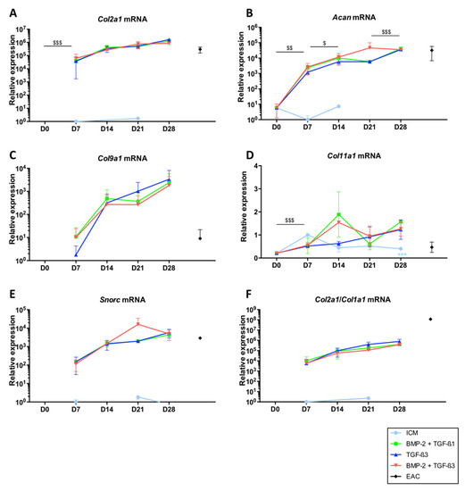 Regarding the Col1a1 and Col1a2 mRNAs (Figure 5A,B, respectively), the patterns were identical in the different growing conditions. Thus, culture in ICM led to the synthesis of smaller amounts of their respective messengers compared with culture conditions in the presence of growth factors and appeared to decrease with the duration of culture time. However, ICM did not lead to the protein synthesis of type II collagen and therefore is not favourable for the synthesis of a hyaline-like neocartilage substitute.