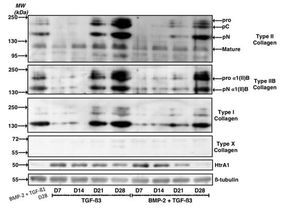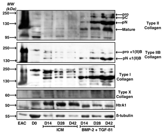 The study of ECM protein synthesis in these experimental conditions indicated that a longer incubation period of 42 days led to a strong increase in total type II collagen, including proα1(II)B and pNα1(II)B collagen, characterizing mature chondrocytes (Figure 10). However, the same pattern was observed for type I collagen, which showed high expression in the ECM in these culture conditions, compared with a culture of 14 or 28 days. In the control ICM condition, the expression of type I collagen, however, decreased with culture time, although the expression of β-tubulin was also lower at 14 and 42 days compared with the culture of 28 days. Type X collagen was still not detectable after 42 days of culture, whereas HtrA1 stabilized between 28 and 42 days of culture.