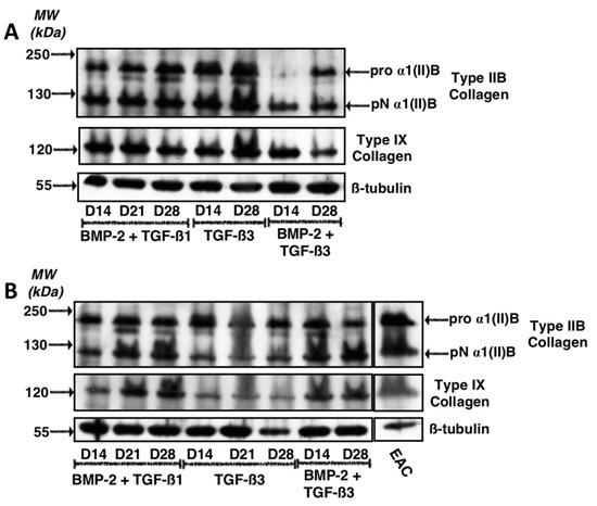 Expression of type IX and IIB collagens after culture in the presence of BMP-2 and TGF-β1 or TGF-β3 used alone or in combination with BMP-2. Equine MSCs derived from bone marrow were amplified and seeded in collagen sponges at P4 (n = 2). They were then cultured in hypoxia (3% O2) for 14, 21 and 28 days (D14, D21 and D28, respectively) in the presence of incomplete chondrogenic medium (ICM) supplemented with TGF-β3 (10 ng/mL) alone or in combination with BMP-2 (50 ng/mL) (BMP-2 + TGF-β3) or BMP-2 (50 ng/mL) and TGF-β1 (10 ng/mL) (BMP-2 + TGF-β1). The sponges were harvested and crushed. The total protein extracts were separated by electrophoresis on 10% acrylamide gel under denaturing conditions. The proteins were then transferred to a membrane which was incubated with the anti-collagen IIB, anti-collagen IX or anti-β-tubulin primary antibody. The molecular weight (MW kDa) is indicated on the left. Two representative experiments from two strains of MSCs are shown in panels (A,B). EAC: equine articular cartilage.