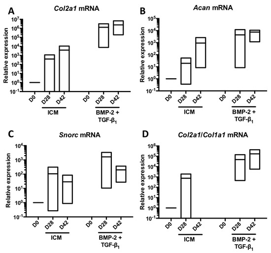 Increase in the culture time of MSCs in the presence of BMP-2 and TGF-β1 to a total of 42 days and its influence on the expression of mRNAs encoding specific markers of hyaline articular cartilage. Equine MSCs derived from bone marrow were amplified and seeded in collagen sponges at P4 (n = 3). They were then cultured in hypoxia (3% O2) for 28 and 42 days (D28 and D42, respectively) in the presence of incomplete chondrogenic medium (ICM) alone or in association with BMP-2 (50 ng/mL) and TGF-β1 (10 ng/mL) (BMP-2 + TGF-β1). The D0 condition corresponds to the stem cells cultured in monolayer at P4 with the amplification medium. mRNA levels of Col2a1 (A); Acan (B) and Snorc (C) were estimated by RT-qPCR after normalization relative to the β-actin reference gene. The Col2a1:Col1a1 ratio is shown (D). The results are presented as floating bars (mean, extreme values) and the significance of the values was tested using Student’s t-test.