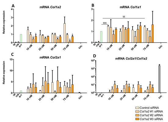 Col1a1 mRNA analysis indicated that transfection with Col1a2 siRNA does not modulate its expression (Figure 11B). Furthermore, there was no significant effect when the cells were transfected with 25 and 50 nM of siRNAs, although off-target effects or an indirect effect via the production of other proteins caused by the silencing of Col1a2 were observable with 75 nM of Col1a2 #3 siRNAs. Concerning Col2a1 mRNA (Figure 11C), although there was some inter-strain variability, transfection by different siRNAs led to no significant modulation of its expression. Finally, analysis of the Col2a1:Col1a2 ratio indicates that transfection with Col1a2 siRNA #2 led to an increase in this ratio, regardless of the concentration (Figure 11D). This ratio was enhanced by 10-fold compared with the B + T condition, although it remained lower than that found in EACs, due to persistent expression of Col1a2 mRNA in the MSC culture. There was no Col1a2 expression in EACs (Figure 11A).