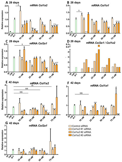 When the cells were cultured for 42 days, transfection with Col1a2 siRNA #3 (10 and 50 nM) led to a highly significant inhibition of the expression of Col1a2 mRNAs (Figure 12E). Moreover, 50 nM of Col1a2 siRNAs #2 caused a 50% decrease in the expression of the target compared to the control siRNA condition. Furthermore, transfection with Col1a2 siRNAs #3 invariably led to a very strong inhibition of the expression of Col1a1 mRNAs (Figure 12F), whereas the Col1a2 siRNA #1 did not appear to have a significant effect and Col1a2 siRNA #2 caused a modest decrease in the expression of Col1a1 compared with control siRNA and with the B + T cocktail alone (no siRNA). At 75 nM, Col1a2 siRNA #2 caused off-target effects and led to increased expression of Col1a1 mRNAs. Moreover, with regard to the expression of Col2a1 mRNAs, Col1a2 siRNA #3 caused a collapse in its expression, suggesting a strong off-target effect (Figure 12G), whereas none of the other conditions modulate the expression of Col2a1.