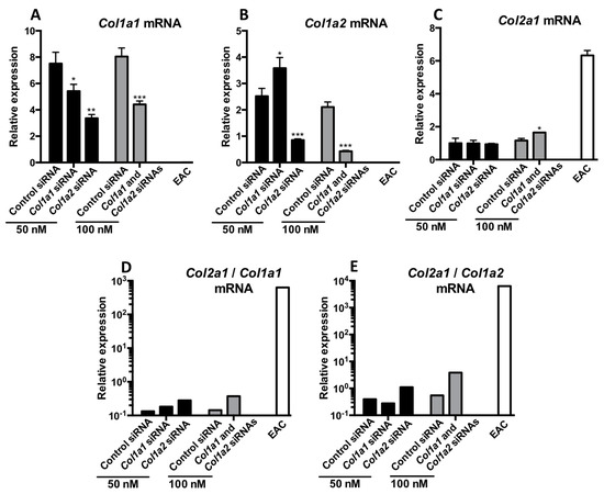 Col1a1 siRNA caused a 30% decrease in the mRNA amounts of its target (Figure 13A) compared with the control siRNA condition, whereas the Col1a2 siRNA caused a 50% knockdown of Col1a1 mRNAs%. Simultaneous transfection of the two siRNAs induced the same 50% inhibition in Col1a1 mRNA expression. Similarly, transfection with the Col1a2 siRNA alone or in association with Col1a1 siRNA induced a decrease of approximately 50% in the expression of Col1a2 (Figure 13B). None of the experimental conditions studied here influenced the expression of Col2a1 (Figure 13C). Finally, the Col2a1:Col1a1 (Figure 13D) or the Col2a1:Col1a2 ratios (Figure 13E) were highest when the cells were transfected with Col1a2 siRNA alone or combination with Col1a1 siRNA, even though this ratio was lower compared to that observed in EACs.