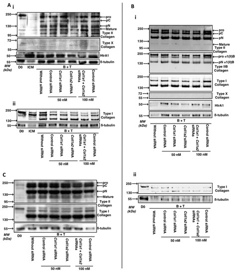 Effect of Col1a1 and/or Col1a2 siRNAs on the protein levels of specific and nonspecific markers of chondrocytes derived from MSCs cultured for 14, 28 and 42 days. Equine MSCs derived from BM were amplified and seeded in type I/III collagen sponges at P4 (n = 3, one of three representative experiments is shown). They were then cultured in hypoxia (3% O2) for 14, 28 and 42 days (A–C respectively) in incomplete chondrogenic medium (ICM) in the presence of BMP-2 (50 ng/mL) and TGF-β1 (10 ng/mL). The MSCs were transfected with a control siRNA or Col1a1 and/or Col1a2 siRNAs (50 nM of each siRNA was transfected). After 14, 28 and 42 days of culture, the total protein extracted (15 µg for panels A and C; 5 µg (panel Bi) and 2.5 µg (Bii)) from type I/III collagen sponges were separated by electrophoresis on a 10% acrylamide gel under denaturing conditions. Panels Ai (type II and X collagens and HtrA1) and Aii (type I collagen) represent western-blots obtained from two strains. The proteins were then transferred to a PVDF membrane and the latter was incubated with the anti-collagen II, anti-collagen I, anti-collagen X, anti-HtrA1 or anti-β-tubulin primary antibody. The molecular weight marker (MW, kDa) is indicated on the left of the panels. D0: stem cells grown in amplification medium; ICM: MSCs cultured in ICM medium without growth factors.