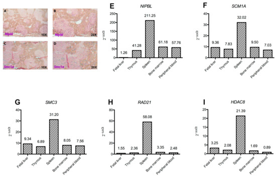 All human hematopoietic tissues analyzed—fetal liver, thymus, spleen, bone marrow, and peripheral blood- displayed high levels of NIPBL, SMC1A, SMC3, RAD21 and HDAC8 expression. In particular, the spleen showed the most abundant levels, ranging from 20 folds (HDAC8) to 200 folds—NIPBL—increased expression. On the other hand, an opposite expression pattern was observed in the fetal liver, whereas HDAC8 and RAD21 showed the lowest levels of expression in the peripheral blood (Figure 1).