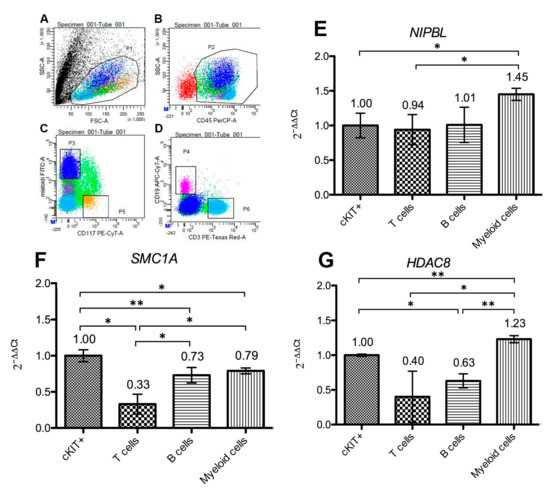 Analysis of bone marrow cell subpopulations. (A–D) FACS cell sorting analysis of subpopulations was achieved with specific antibodies recognizing c-KIT/CD117 (correspondent to multipotent progenitor cells), myeloid cell antigens (antibodies mix anti-CD15 and anti-CD33), CD3 (to select T lymphocytes) and CD19 to detect B lymphocytes, respectively. As a hierarchical gating strategy, the four cell subsets were selected on CD45 positive population, which represents a pan-leukocyte antigen, to identify white blood cells. Dot plots of dimensional scatters (FSC and SSC) are shown, in addition to sorting gates, P3 (myeloid cells), P4 (B cells), P5 (precursors) and P6 (T cells). Histograms (E–G) show SMC1A core subunit, NIPBL loading factor and HDAC8 regulator gene expression as 2−ΔΔCt in stem cells (cKIT+), T cells, B cells and myeloid cells. Error bars represent standard deviation. Asterisks indicate statistically significant values: * p ≤ 0.05; ** p ≤ 0.005.