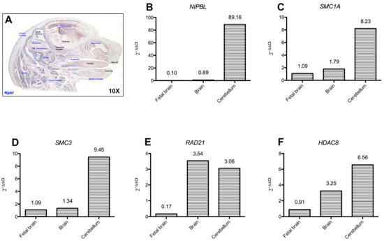 Moving to another likely relevant tissue/compartment, we showed that both fetal and adult cerebellum samples consistently express high levels of cohesin complex genes. As during adult life, the proliferative cells in this organ are limited, the non-canonical role of cohesin is postulated to be prominent in this district. Only a few indications of cerebellum-specific clinical findings emerge from the literature on cohesinopathies models and human patients [37]. Out of these, in D. rerio, both smc1a and nipblb haploinsufficiency result in abnormalities of the hindbrain, the embryonic precursor of the cerebellum [24,26] and it is interesting that out of the structures found to express cohesins during development, the majority were hindbrain-derived (as pons, medulla oblongata and choroid plexus).