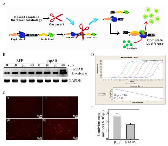 The fragments of papA (5′-ATGAACGAAGCATATGTACATGACGGTCCTGTACGCTCACTGAAC-3′) and pepB (5′-AAGGCACGAAAGGAAGCAGAACTGGCAGCAGCAACTGCAGAACAG-3′) were constructed in split luciferase PLAS3.1-neo lentivirus plasmid with 3X caspase 3 cleavage sequences (5′-GACGAAGTCGATGACGAAGTCGATGACGAAGTCGAT-3′). The NIADS construct or the RFP (red fluorescent protein) plasmid was co-transfected with pMD2.G (Addgene plasmid #12259) and psPAX2 (Addgene plasmid #12260, both kindly provided by Didier Trono, EPFL, Lausanne, Switzerland). Lentiviral particles were collected at 36 and 72 h and then concentrated with a Lenti-X Concentrator® (Clontech, Mountain View, CA, USA). The lentivirus concentration for each gene was quantified by qPCR. Biohazards and restricted materials were used in this study in accordance with the “Safety Guidelines for Biosafety Level 1 to Level 3 Laboratory”. The protocol was approved by the Institutional Biosafety Committee at Taipei Medical University, Taipei, Taiwan. The lentivirus concentration for each gene was quantified by qPCR. MDA-MB-231 cells were infected in a 6-cm dish, with each well containing 1 × 106 cells and indicated concentrations of lentivirus for 48 h.