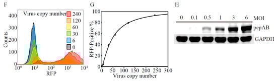 MDA-MB-231 (1 × 106 cells/dish) were plated in 6-cm dishes for infection. An equal number of virus particles and MDA-MB-231 cells was defined as 1-fold. MDA-MB-231 cells were exposed to different folds of concentrated virus harboring the RFP plasmid. Lentivirus-transduced cells were harvested three days after infection, and the RFP-positive cell population was analyzed by flow cytometry (FACSCalibur, BD Biosciences, San Jose, CA, USA).