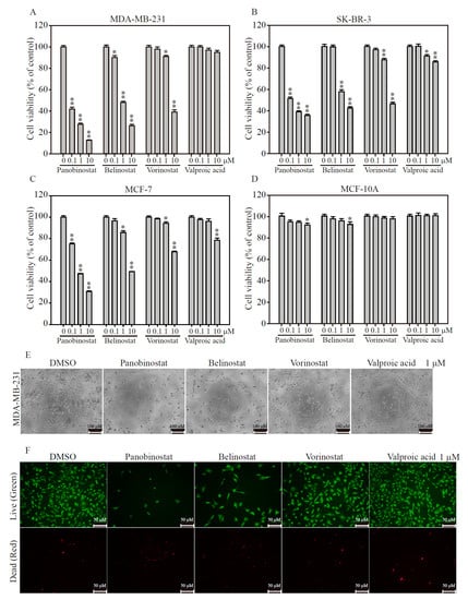 HDACi inhibits breast cancer cell viability and enhances cell apoptosis. Dose-dependent manner of 0.1, 1 and 10 μM Panobinostat, Belinostat, Vorinostat and Valproic acid inhibits (A) MDA-MB-231; (B) SK-BR-3; (C) MCF-7 breast cancer cells and (D) normal breast epithelia cells viabilities for 48 h by MTT assay determination; (E) The cell morphology change of 1 μM HDACi treatment for 48 h on MDA-MB-231 cells. Scale bars: 100 μM; (F) Fluorescence images of 1 μM HDACi exposed MDA-MB-231 cells for 48 h and determined by LIVE/DEAD viability/cytotoxicity assay. The cells were co-stained with 1 μM calcein-AM/10 μM PI and excited with light of 488 nm (green emission) to show viable cells. The same image of the cells was also excited with light of 532 nm, (red emission) to show the dead cells. Scale bar: 50 μM. Data are presented as the mean and standard error. Data were analyzed with Student’s t-test; all p-values were two-sided. p-values less than 0.05 are indicated with an asterisk, less than 0.01 is presented with two asterisks.