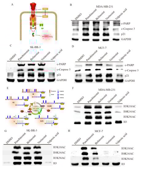 Previous studies have shown that the use of HDACi forced cancer cell arrest either at the G1 or G2 phases of the cell cycle, resulting in cell growth inhibition and an increase in the percentage of apoptotic cells through both the death-receptor and intrinsic apoptotic pathways activation [13,14,15]. This apoptosis mechanism induced by HDACi enhances Fas-associated death domain protein (FADD) recruitment to TRAIL receptor (Tumor necrosis factor-related apoptosis-inducing ligand, DR4) in the death-inducing signaling complex, such as activation of membrane-proximal activator caspases (caspase-8) and effector caspases (caspase-3) (Figure 3A) [16]. To confirm that, we measured apoptotic markers in breast cancer cells with HDACi addition. In the presence of 1 μM of HDACi for 24 h, MDA-MB-231 showed a significant cleavage form of PARP (c-PARP) and caspase 3 (c-caspase-3) with Panobinostat, Belinostat and Vorinostat treatments (Figure 3B), compares to DMSO treatment. Furthermore, this apoptosis induction is also observed in SK-BR-3 (Figure 3C) and MCF-7 (Figure 3D) cells, but with less effectiveness in the Vorinostat treatment on MCF-7 cells. Beyond that, a cell cycle repressor protein, p21, was also significantly induced in the presents of Panobinostat, Belinostat and Vorinostat on breast cancer cells, which confirms the previous finding that HDACi forced cancer cell cycle arrest. Next, to investigate how HDACi impacts chromatin architecture and cell cycle regulation, we generated a schematic diagram of the effective H3 and H4 modifications during cell cycle progress (Figure 3E) [17,18]. In chromatin modification, phosphorylation, acetylation and different levels of methylation are playing important roles in cell cycle regulation. Since p21 presents outstanding enhancement in HDACi addition, showing p21 may inhibit the kinase activities of both cyclin dependent kinase 4/6 and cyclin dependent kinase 2, resulting in G1 and S phase cell cycle arrest, respectively. Thus, in this study, we selected three major histone acetylation sites that might mediate G1 and S phase cell cycle arrest in HDACi exposure, whereas the acetylation sites of H3K56 and H4K16 are presented in G1/S phase, and the acetylation site of H3K18 is additionally presented in S phase of cell cycle. The immunoblotting assay shows Panobinostat, Belinostat and Vorinostat strongly acetylate the sites of H3K18, H3K56 and H4K16 histone proteins on MDA-MB-231 (Figure 3F) and SK-BR-3 (Figure 3G) breast cancer cells. However, only Panobinostat acetylates H3K18, H3K56 and H4K16 histone proteins, whereas Belinostat weakly acetylates these three histone sites on MCF-7 (Figure 3H) cells. These data demonstrate that HDACi treatment induced breast cancer apoptosis or cell cycle arrest may be mediated from transcriptionally activation of CDKN1A gene by H3 and H4 modifications.