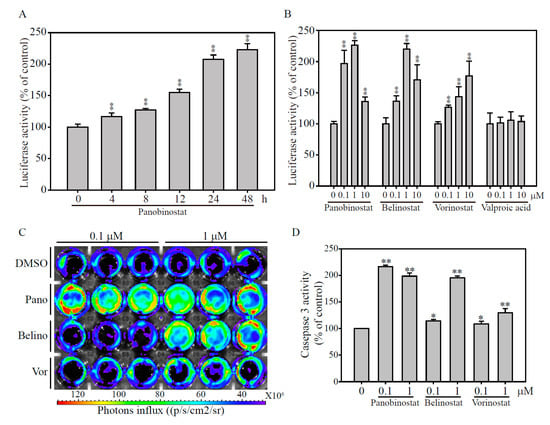 HDACi-induced apoptosis through NIADS assay. (A) A time-dependent manner (from 4 to 48 h) of Panobinostat treatment on NIADS-MDA-MB-231 cells. The cells received 1 μM of Panobinostat and their luciferase activity was measured. (B) Dose-dependent manner (from 0.1 to 10 μM) of HDACi treatments on NIADS-MDA-MB-231 cells. The cells received HDACi for 24 h tand heir luciferase activity was measured. NIADS-MDA-MB-231 cells treated with DMSO or HDACi from 0.1 and 1 μM for 24 h were detected with their luciferase activity (present by photos influx). (C) The IVIS image clearly shows that the luciferase activity is predominantly higher in Panobinostat and 1 μM of Belinostat treatments. (D) The photo influx calculation from the IVIS image was demonstrated. Data are presented as the mean and standard error. Data were analyzed with Student’s t-test; all p-values were two-sided. p-values less than 0.05 are indicated with an asterisk, less than 0.01 is presented with two asterisks.