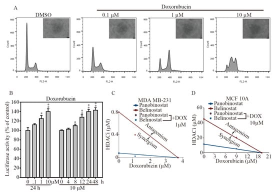 HDACi synergiclly enhances anti-cancer activity of doxorubicin through NIADS assay (A) The cell cycle analysis of doxorubicin treatments from 0.1 to 10 μM on MDA-MB-231 cells by flow cytometry determination. The cell morphology changes by doxorubicin exposure were also demonstrated; (B) A dose-dependent manner (from 0.1 to 10 μM) and a time-dependent manner (from 4 to 48 h) of doxorubicin treatment on NIADS-MDA-MB-231 cells were evaluated for their luciferase activity. Combination Index (CI) values of Panobinostat/Belinostat and doxorubicin treatment on (C) MDA-MB-231 and (D) MCF10A IC50. The red dot and blue dot represent the synergistic effects of doxorubicin treatment with 1 µM Panobinostat and Belinostat, respectively. Data are presented as the mean and standard error. Data were analyzed with Student’s t-test; all p-values were two-sided. p-values less than 0.05 are indicated with an asterisk, less than 0.01 is presented with two asterisks.
