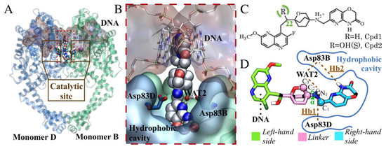 In more detail, the chemical scaffold of NBTIs comprises two heterocycles connected via an aliphatic linker, usually containing a basic nitrogen (Figure 1D) [26]. Structural data have shown that NBTIs interact via hydrophobic contacts with the target, forming π–π interactions between two bases of the DNA. The linker portion also establishes a conserved H-bond with the side chain of Asp83 of monomer D (Asp83D) at the binding site (PDB 4PLB, Figure 1B) [21,23,27,28,29,30].