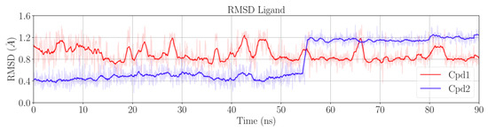 After the equilibration phase (~10 ns), the protein and the DNA were stable. The RMSD values were ~1.6 ± 0.1 Å for the protein in both Sys1 and Sys2, and ~1.0 ± 0.1 Å for DNA in both Sys1 and Sys2 (Figure S1). Cpd1 was also stable for the entire simulation, with an RMSD of ~0.9 ± 0.2 Å (Figure 2). Conversely, Cpd2 remained very stable for only the first ~55 ns of the trajectory, showing a low RMSD value of ~0.5 ± 0.1 Å. Then, the RMSD suddenly increased to ~1.2 ± 0.1 Å, suggesting a conformational rearrangement that was firmly maintained until the end of the simulation (Figure 2).