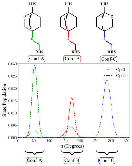 State population of the value of the α dihedral angle for both Cpd1 and Cpd2 computed over the simulated time. For Cpd1, the α dihedral angle populates the three conformational states, Conf-A, Conf-B, and Conf-C. Cpd2 visits only Conf-A and Conf-B.