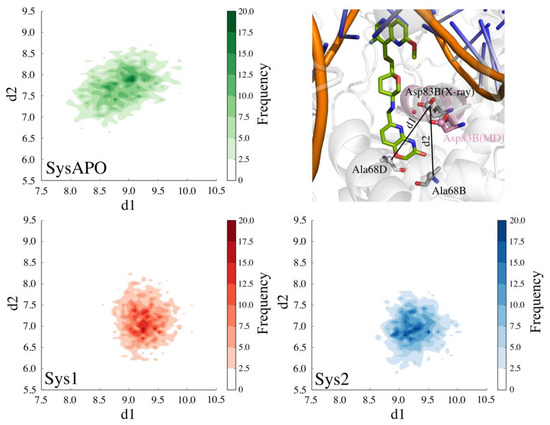 2D plot of SysAPO (green), Sys1 (red), and Sys2 (blue) MD trajectory data plotted along d1 (distance between the Cγ of Asp83B and the Cα of Ala68D) and d2 (distance between the Cγ of Asp83B and the Cα of Ala68B).