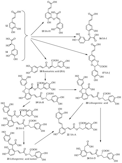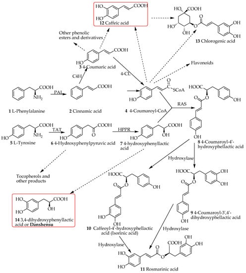 The lack of real progress in dementia therapy is evident from the existing therapeutic approaches that all put their focus in reducing the progressive clinical symptoms instead of cure. Thus, a great deal of global efforts has been placed to look for potential drugs from both synthetic and natural sources that offer novel approaches or unique molecular targets. Beyond our own input in this search efforts, review articles from our laboratories have scrutinized the anti-AD potential of numerous natural products in general [6] and specifically those belonging to the class of monoterpenes (e.g., the iridoids class) [7], diterpenes [8] and flavonoids [9,10,11,12,13]. The other natural product that we highlighted as potential therapy for dementia was caffeic acid along with its ester derivatives such as chlorogenic acid and caffeic acid phenethyl ester [14]. The fairly few steps in the biosynthetic pathway of caffeic acid and related compounds (see Figure 1) and its ubiquitous presence in our common food ingredients such as coffee, cherries, apples and honey give us even more incentive to investigate these compounds as potential leads. The present review is designed to investigate the molecular and gross pharmacological profile related to dementia of compounds called salvianolic acids and rosmarinic acid (RA). Structurally, these compounds are composed of caffeic acid (structure 12) and a related phenolic compound, danshensu (3,4-dihydroxyphenyllactic acid, structure 14, Figure 1).
