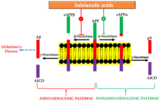 A summary of in vitro effects that attributes to the potential therapeutic effects of salvianolic acid derivatives are shown in Table 1 [29,30,31,32,33,34,35,36,37,38,39,40,41,42,43,44,45]. By assessing the β-secretase (β-site amyloid precursor protein (APP) cleaving enzyme or BACE1) and γ-secretase inhibitory activity, a selective effect against BACE1 was demonstrated for SA-B [32]. Moreover, the direct interaction of the compound with the catalytic center of the enzyme has been confirmed by docking experiments [32]. In SH-SY5Y-APPsw cells, the Aβ40 and Aβ42 levels in culture media has been shown to be suppressed by SA-B [33]. While the protein expression of APP was not affected by SA-B, it has been shown to increase the protein level expressions of “a disintegrin and metalloproteinase domain-containing protein 10” (ADAM10) and secreted APP-α (sAPPα) concomitantly with the decreased protein expressions of BACE1 and sAPPβ [33]. Such observation is in perfect agreement with the postulated mechanism of action via inhibition of Aβ formation (Figure 3). The nonamyloidogenic pathway via the ADAM10 as a classic example of α-secretase within the Aβ domain that breaks down APP has now been well established [46,47]. Interestingly, SA-B has been reported to increase the activity of α-secretase while suppressing β-secretase. Hence, an augmented α-secretase pathway which is nonamyloidogenic and a decrease in Aβ generation via amyloidogenic pathway was evident for SA-B (Figure 3).