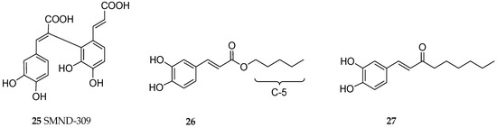Structures of some synthetic analogues with proven biological effects related to dementia. SMDD (25) is a caffeic acid dimer that does not involve an ester bond but rather a C-C bridge. The C-5 chain derivative, compound 26, was found to have an optimum structure in antioxidant and Aβ aggregation inhibition studies from studies on derivatives including C-3 to C-9 chain length, while compound 27 was a prototype lead compound that does not have an ester linkage.
