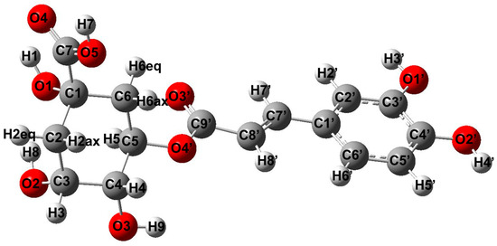The geometrical parameters for chlorogenic acid and its alkali metal salts calculated for the gas phase and methanolic solution are shown in Table S2. The most visible differences between the particular compounds concern the geometry of the carboxylate anion, i.e., C7-O5 and C7-O4 bond lengths, as well as the O5-C7-O4 angle (atom numbering in Figure 5). This is not surprising, because in the series of studies of compounds a change of alkali metal cation in the carboxylate moiety occurs. Generally, the bonds between carbons and hydroxyl substituents in the quinic moiety, i.e., C1-O1, O1-H1, C3-O2, O2-H8 and C4-O3, are longer in the salt molecules compared with chlorogenic acid. This is due to the increase in the strength of the hydrogen bonds H1···O4, H8···O1 and H9···O4′ in the series 5-CQA⟶Li⟶Na⟶K 5-CQAs. This is manifested by the decrease in the lengths of the hydrogen bonds as well as a decrease in the values of the NBO atomic charges gathered on the oxygen atoms and an increase in the charges on hydrogen atoms (Tables S2 and S3). This is more explicit for the H1···O4 and H8···O1 than H9···O4′, and the hydrogen bonds H1···O4 and H8···O1 are stronger than H9···O4′. For the acid molecule, the bond H8···O1 is stronger than H1···O4. In the case of salts, the situation is the opposite, the H1···O4 becomes stronger than H8···O1, this is due to the presence of alkali metal cation in the carboxylate moiety and an increase in negative charge on the O1 atom (Δmax = −0.023 e for gas phase, Δmax = −0.034 e for methanol). The observed effect is mostly visible for the parameters calculated in methanolic solution than in the gas phase.