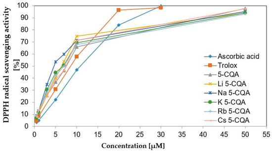 The antioxidant properties of methanolic solutions of chlorogenic acid and alkali metal chlorogenates was measured by DPPH and FRAP assays [53]. The obtained results are presented in Table 4 and Figure 2. Alkali metal salts of chlorogenic acid show slightly better antioxidant activity than the ligand alone. In the DPPH assay the EC50 parameter equals 7.39 μM for 5-CQA and in the range of 4.50–5.89 μM for salts. Moreover, in the DPPH assay, 5-CQA and its alkali metal salts possess higher antioxidant properties than commonly known antioxidants: Trolox (EC50 = 8.25 μM), l-ascorbic acid (EC50 = 10.87 μM) and BHT (EC50 = 52.80 μM). Furthermore, taking into account the increase in the EC50 value in the series Na⟶Li⟶K⟶Rb⟶Cs 5-CQAs⟶5-CQA a decrease in the antioxidant activity along with the mentioned series can be concluded. The antioxidant activity of the studied compounds measured in the FRAP assay increases with the increase in their concentration. The FRAP values for two different concentrations (5 and 2.5 μM) of studied compounds are respectively 114.22 and 72.53 μM Fe2+ for 5-CQA, whereas for salts these are 106.92–141.13 and 78.93–132.00 μM Fe2+. In the series of Na⟶K⟶Rb⟶Cs 5-CQAs⟶5-CQA a decrease in the ferric reducing antioxidant activity occurs. Lithium salt does not follow this rule, its antioxidant properties measured in FRAP assay are lower even than the activity of chlorogenic acid. In the FRAP assay the measurements are done for almost aqueous solutions (400 μL of methanolic sample plus 3000 μL of aqueous FRAP solution), whereas in the case of DPPH assay for the methanolic solutions. The EC50 value obtained in the DPPH assay for lithium salt is slightly lower than that for sodium salt, whereas the FRAP values clearly show that in the case of lithium chlorogenate some additional interactions in the aqueous solution may occur that affect the final results and caused the lithium 5-CQA to be a weaker antioxidant than the rest of the tested compounds in the FRAP assay. Because the FRAP test was conducted in aqueous media, the hydration of lithium ion may be important factor which should be taken into consideration. The lithium cation is smaller than the other alkali metal ions and the interactions between water molecules and lithium ions seems to be different than that between the water molecules and other alkali metal cations. There are data in the literature that shows that the hydration of the lithium cation from the salt molecule affects its properties and causes that lithium to not follow the period low, e.g., in the studies of hydrophobicity of alkali metal salts of warfarin and the taste response to these salts in mice [59]. According to Mähler and Persson, who studied the hydration of alkali metal ions in aqueous solution, the lithium cation may form a second hydration sphere in contrast to sodium ion and probably other heavier alkali metal cations [60].