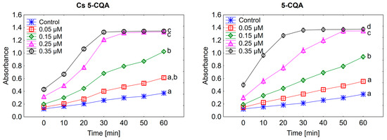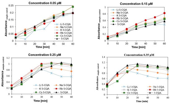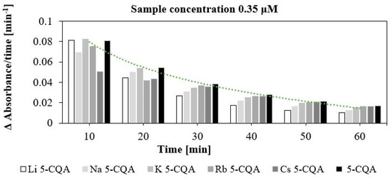 Chlorogenic acid and chlorogenates were also tested for their pro-oxidative effect on trolox oxidation. The radicals of chlorogenic acid and chlorogenates are produced in their reaction with H2O2 catalysed by horse radish peroxide. Then the phenoxyl radicals react with trolox which undergoes oxidation to trolox radicals and then trolox quinones. Whereas the phenoxyl radical are transformed to phenolic compounds. The maximum absorption for trolox quinone is 272 nm. This is a general procedure to study the pro-oxidant activity of phenolic compounds [54]. In Figure 3 the effect of 5-CQA and its alkali metal salts with different concentrations of the oxidation rate of trolox is shown. The pro-oxidant effect depends on the type of compound and its concentration. With the increase in the concentration the pro-oxidant capacity of compounds increase. For the two selected concentrations, i.e., 0.05 and 0.15 μM, the oxidation of trolox did not finish after 60 min of measurement. Whereas for the last two concentrations, i.e., 0.25 and 0.35 μM, the oxidation of trolox finished after 20–50 min depending on the type of compound. In the case of 0.25 μM the reaction came to an end after 30 min. for Li and Na 5-CQAs, 40 min. for K and Rb 5-CQAs and 50 min. for chlorogenic acid. The rate of trolox oxidatation increased with another increase in concentration, i.e., in the case of 0.35 μM solution the reaction finished after 20 min for Li, Na and K 5-CQAs, and 30 min. for Rb and Cs 5-CQAs as well as 5-CQA. This can be seen very well in Figure 3, where the effect of different concentrations (0.05–0.35 μM) of chlorogenic acid and its alkali metal salts on the oxidation of trolox was depicted. Even at 60 min of measurement of the reaction course the absorbance still increases when the tested compounds are at the 0.05 and 0.15 μM (Figure 4). The maximum pro-oxidant activity is reached at a higher concentration (in our experiment: 0.25 and 0.35 μM, Figure 5) after a maximum 50 min of measurement. Then, for both the higher concentrations (0.25 and 0.35 μM) a clear trend occurs: the pro-oxidant activity of the studied compounds increases in the series of Li⟶Na⟶K⟶Rb⟶Cs 5-CQAs⟶5-CQA (Figure 5). Besides this, the presence of the catechol moiety, the type of metal in the carboxylate group of chlorogenate is crucial for the pro-oxidative properties of tested compounds. The pro-/antioxidative activity of phenolic compounds or their alkali metal salts is sometimes correlated with the increase in their lipophilicity [59].
