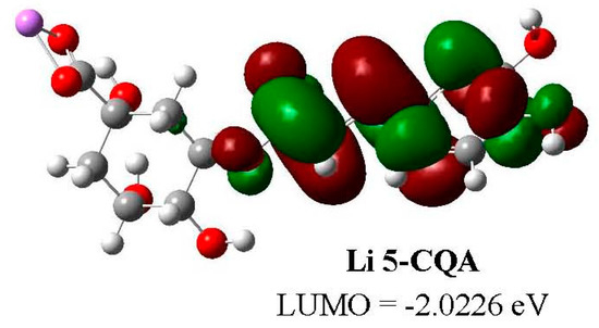 The HOMO (highest occupied molecular orbital) and LUMO (lowest unoccupied molecular orbital) orbitals calculated in gas phase 5-CQA and Li 5-CQA.