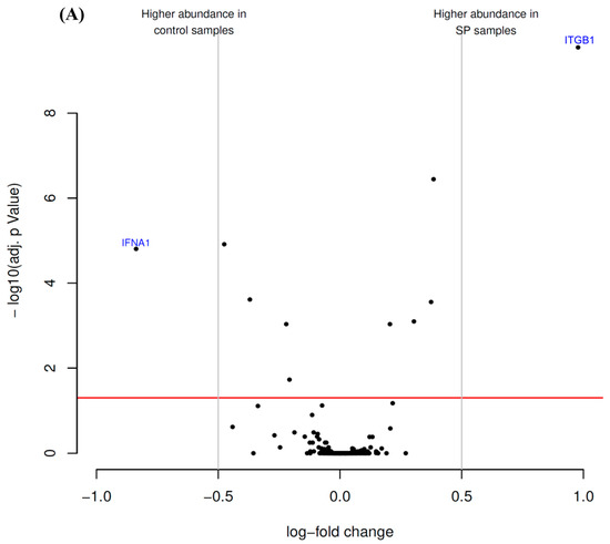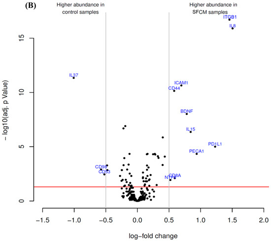 Antibody microarray identified differentially enriched proteins after the treatment of hTCEpi cells with (A) substance P (SP) and (B) stromal fibroblasts conditioned medium (SFCM). The volcano plot visualizes the p-values (adjusted for multiple testing) and corresponding log-fold changes. The log-fold change of the difference in abundance is shown horizontally whereas the vertical axis indicates the significance level. The black dots represent the analyzed proteins. The horizontal red line indicates an adjusted p-value of 0.05, above which all proteins are considered to vary significantly. Proteins with a positive log-fold change had a higher abundance in SP or SFCM samples whereas proteins with a negative value in control samples.