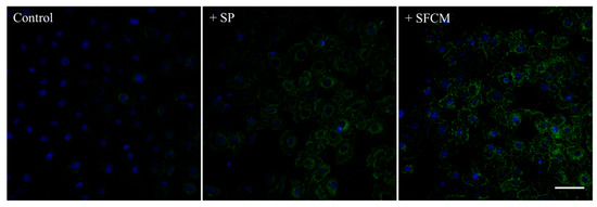 Immunofluorescence detection of the total protein tyrosine phosphorylation in hTCEpi cells after treatment with SP and SFCM. Growth factor-starved hTCEpi cells were cultured in the presence of SP and SFCM for 24 h and the protein tyrosine phosphorylation was analyzed by staining with an anti-phosphotyrosine (green) antibody. An increase in the total protein tyrosine phosphorylation was observed in hTCEpi cells treated with SP and SFCM. Nuclei were counterstained with 4,6-diamidino-2-phenylindole (DAPI) (blue). Scale bar: 50 μm.