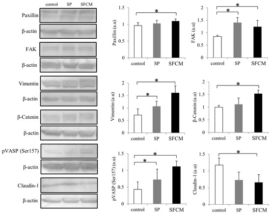 Activation of important signaling molecules paxillin, focal adhesion kinase (FAK), vimentin, β-Catenin, phosphorylation of vasodilator-stimulated phosphoprotein (VASP) and claudin-1 following SP and SFCM stimulation in hTCEpi cells. Protein lysates were collected after 24 h of stimulation and subjected to immunoblot analysis. Relative expression levels of the individual proteins were analyzed using respective antibodies. Corresponding β-actin protein levels were used to compare and calculate the differences in the expression levels. Data represent the mean of the expression levels (n > 3) shown as arbitrary units. Bar graphs indicate the mean expression levels after 24 h of treatment with SP and SFCM. The p-values of <0.05 were considered statistically significant and are indicated by asterisks (*).