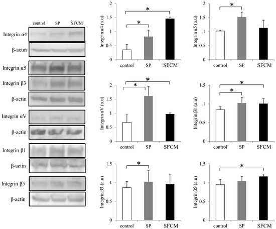 Differences in the expression of various integrin subunits (α4, α5, αV, β1, β3 and β5) following SP and SFCM stimulation in hTCEpi cells. Protein lysates were collected after 24 h of stimulation and subjected to immunoblot analysis. Relative expression levels of the individual proteins were analyzed using respective antibodies. Corresponding β-actin protein levels were used to compare and calculate the differences in the expression levels. Data represent the mean of the expression levels (n > 3) shown as arbitrary units. Bar graphs indicate the mean expression levels after 24 h of treatment with SP and SFCM. The p-values of <0.05 were considered statistically significant and are indicated by asterisks (*).