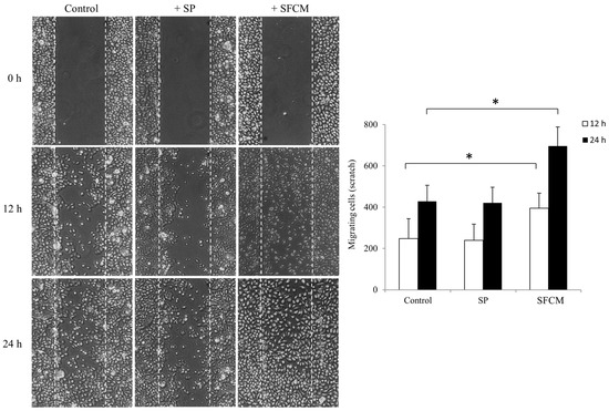 Wound healing scratch assay was made on 24 h growth factor-starved, confluent hTCEpi cells by scratching a line across the bottom of the culture dish. SP and SFCM were added to the culture media and the cell motility and migration was observed at time points 12 h and 24 h, respectively. The micrographs show the extent of scratch closure obtained under control conditions compared to those with the addition of SP and SFCM. Cell migration quantification was evaluated by counting the number of cells in the central gap. Three independent experiments were performed and a representative result is shown. The p-values of <0.05 were considered statistically significant and are indicated by asterisks (*).