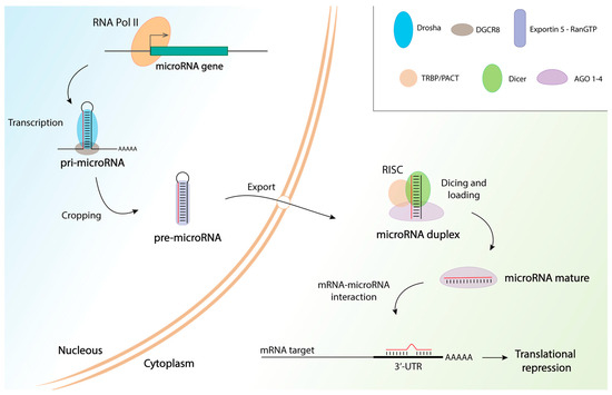 miRNAs about 20–22 nt long are the dominant class of small non-coding RNA in most tissues and are derived from nuclear transcripts with characteristic stem–loop structures (pri-miRNAs). The first step in miRNA biosynthesis is pri-miRNA cleavage, mediated by a processing complex comprising the RNase III Drosha and DiGeorge syndrome critical region 8 (DGCR8), also known as the microprocessor complex. Nuclear processing involves cropping the stem–loop to release a small hairpin-shaped RNA (pre-miRNA), which is then transported into the cytoplasm through exportin 5 where maturation can be completed. The second processing step is mediated by the RNase III, DICER1, which cleaves the pre-miRNA into 22-nt miRNA duplexes. Usually, one strand from the cleavage products remains as a mature miRNA due to a selective process that depends on thermodynamic stability. Finally, RNA generated is loaded into an AGO protein to form the effector RNA-induced silencing complex (RISC) along with other component such as TAR RNA-binding protein (TRBP) or protein kinase R-activating protein (PACT). miRNAs function as a guide by base pairing with their target messenger RNAs (mRNAs), while AGO proteins recruit factors that induce this translational repression; miRNA-binding sites are usually located at the 3′-untranslated region (UTR) of the target mRNA [75]. Figure 1 shows a schematic of the miRNA biosynthesis pathway along with most of the relevant implicated molecules.