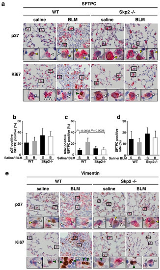 Double immunostaining experiments to identify p27-positive cells were performed using the paraffin-embedded samples from Figure 1. To identify type II alveolar epithelial cells (AECII) and mesenchymal fibroblasts, antibodies against surfactant protein C (SFTPC) and vimentin were used, respectively. Figure 4a–d indicated that Skp2 may partially participate in the cell proliferation of AECII, but this might not be sufficient to affect the abundance of AECII cells. In vimentin-positive mesenchymal fibroblasts, the decrease of p27-positive cells and increase of Ki67-positive cells by BLM-administration was suppressed by Skp2-deficency (Figure 4e–h). Moreover, the increase of mesenchymal fibroblasts by BLM-administration was suppressed by Skp2-deficency (Figure 4e,g). These results suggest that Skp2 may participate in the BLM-induced increase of mesenchymal fibroblasts via the Skp2/p27 axis.