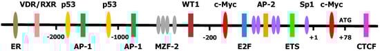 The 5′ promoter region of hTERT has been cloned [14,15,16], and several transcription factors, including c-Myc, Sp1, activating enhancer-binding protein-2 (AP-2), hypoxia-inducible factor 1 (HIF-1), ETS, estrogen receptor (ER), E2F, activator protein 1 (AP-1), vitamin D receptor (VDR) in complex with retinoid X receptor (RXR), p53, Wilms’ tumor 1 (WT1), myeloid zinc finger protein 2 (MZF-2), and CCCTC-binding factor (CTCF), have been found to modulate the transcriptional activity of the hTERT promoter (Figure 1) [17]. Among these transcription factors, c-Myc plays a pivotal role in hTERT mRNA expression. c-Myc can recognize and bind to the E-box consensus sequence (5′-CACGTG-3′) in the target gene promoter. The hTERT promoter contains two E-box sites located at positions −165 and +44 relative to the transcription start site (+1 position). The expression of c-myc mRNA is highly related to the expression of hTERT mRNA [18]. Treatment with antisense c-myc oligonucleotides downregulates c-myc and hTERT expression in human leukemic cells, thus leading to the suppression of cellular telomerase activity [19]. The above findings clearly indicate that c-Myc acts as a crucial signaling factor in the regulation of hTERT transcription.