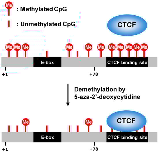Epigenetic modifications (i.e., DNA methylation, histone modifications, and noncoding RNA) alter the recruitment of transcription factors and chromatin structure, thereby affecting gene expression [20]. DNA methylation is catalyzed by DNA methyltransferases (DNMTs) through the addition of a methyl group at the C-5 position of cytosine. These enzymes include DNMT1, DNMT3A, and DNMT3B; DNMT1 participates in the methylation of hemimethylated DNA to maintain the methylation status of daughter strands after the replication process, whereas DNMT3A and DNMT3B are responsible for de novo DNA methylation [21]. The cytosine methylation generally occurs in cytosine–guanine (CG) clusters (referred to as CpG islands). The methyl group in CpG islands is thought to directly block DNA recognition and binding by several transcription factors, meaning that CpG methylation is involved in gene silencing. The hTERT promoter contains many CpG sites, but most CpG islands in this promoter are surprisingly hypermethylated (especially from position −650 to −150 relative to the transcription start site) in telomerase-positive cancer cell lines [22]. Such hypermethylation of the hTERT promoter abrogates binding of transcriptional repressors, such as CTCF and E2F. In fact, treatment of cancer cells with 5-aza-2′-deoxycytidine, a DNA methylation inhibitor, allows CTCF to bind to the hTERT promoter and to repress hTERT expression (Figure 2) [23]. Thus, CpG hypermethylation of the hTERT promoter in tumor cells is intended in part to block binding of the transcriptional repressor, thereby increasing the transcription of the hTERT gene.