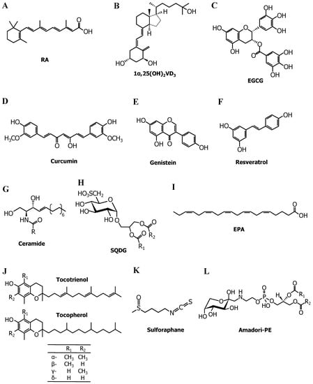 Chemical structures of telomerase modulators. (A) All-trans retinoic acid (RA). (B) 1α,25-Dihydroxyvitamin D3 (1α,25(OH)2VD3). (C) (−)-Epigallocatechin-3-gallate (EGCG). (D) Curcumin. (E) Genistein. (F) Resveratrol. (G) Ceramide. R, acyl chain. (H) Sulfoquinovosyldiacylglycerol (SQDG). R1 and R2 indicate acyl chains. (I) Eicosapentaenoic acid (EPA). (J) Tocotrienol (T3) and tocopherol (Toc). (K) Sulforaphane. (L) Phosphatidylethanolamine-linked Amadori product (Amadori-PE). R1 and R2 indicate acyl chains.