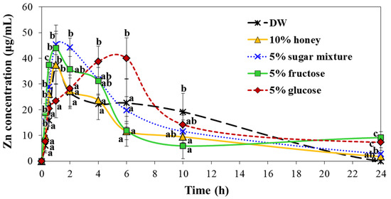 | Biokinetic Parameters | DW | 10% Honey | 5% Sugar Mixture | 5% Fructose | 5% Glucose |