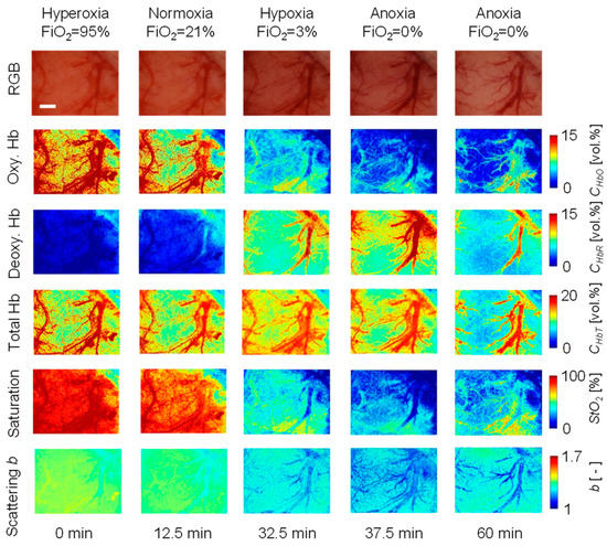 Typical images obtained during hyperoxia, normoxia, hypoxia, and anoxia for the RGB color image, CHbO, CHbR, CHbT, StO2, and b. A scale bar (white line in the RGB image for 0 min) indicates 1.0 mm.