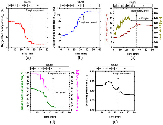 Typical time courses of (a) oxygenated hemoglobin CHbO, (b) deoxygenated hemoglobin CHbR, (c) total hemoglobin CHbT and heart rate HR, (d) hemoglobin oxygen saturation StO2 and (e) arterial oxygen saturation SaO2, and scattering power b averaged over the area for the region of interest (ROI) on the parenchymal region.